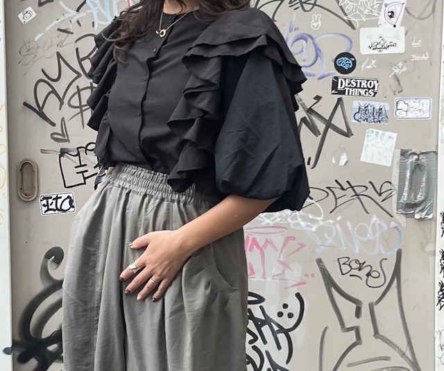 バルーンスリーブ 異素材フリルブラウス<45001>